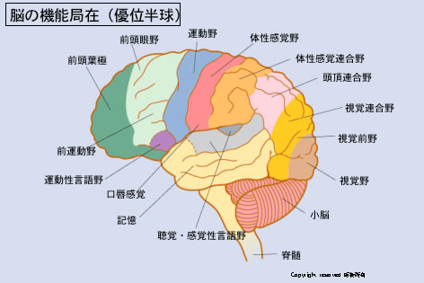 大脳はその場所によって機能が分化しています。例えば前頭葉はものを考える・運動の指令をする、頭頂葉はものを感じ解析する、後頭葉は目からくる視覚情報を取り入れ解析する、側頭葉は記憶や言語、音の解析を行います。これを脳の機能局在と呼びます。(図4)