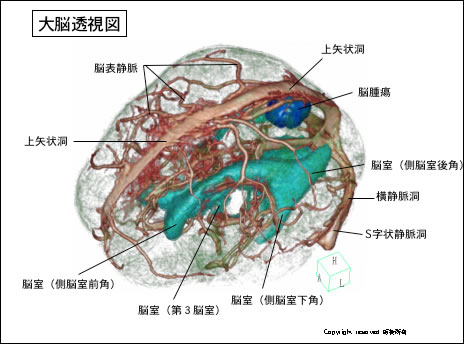 脳は頭蓋骨の中で脳脊髄液という液体のなかに浮かんでいます。その液体は脳室という脳の中の液体で満たされた部屋の中にある脈絡叢という構造物で作られます。脳脊髄液は一日に500ccもつくられ、脳の部屋(脳室)、脊髄周囲、脳の表面を循環し、最後に頭頂部の静脈に吸収されます(図7)。この流れがどこかで堰きとめられると水頭症という状態となり、頭痛、吐き気、意識の低下などが起こります。