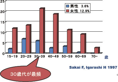 女性の方が男性の4倍片頭痛が多いのです。子どものころは男女同数ですが、生理の始まるころから女性のほうに多くなります。そして30代〜40代に集中して起きます。閉経のころから片頭痛は減りますが、「女性に多い状態」はそのまま継続します。 [図9]