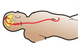 実際のバイパスの経路としては,1)脳室から,おなかの中へ脳脊髄液を流す.(脳室-腹腔シャント)、2)脳室から,心臓のそばの太い静脈へ流す.(脳室-心房シャント)3)腰の背骨の中にある脳脊髄液を,おなかの中へ流す.(腰椎-腹腔シャント)などがありますが、本邦においては、図の脳室-腹腔シャント(V-Pシャント)が最もよく行われています。