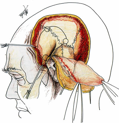 開頭は、全ての脳神経外科手術の基本的手技であり、当然のことながら、脳を直接さわるには、その周囲にある障壁を取り払って到達する必要があります。脳は体の中で最も重要な臓器にも関わらず、きわめて柔らかく壊れやすいので、多重の防護がなされています、表面から皮膚、筋膜(腱膜)、頭蓋骨、硬膜、クモ膜などが脳を包んでいます。これらをあけて脳を露出する手技が開頭術です。