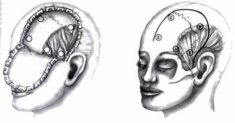 皮膚を切開する部位は脳の病気の種類により様々ですが、多くは髪の毛の中に隠れるようにデザインします。切開部をなるべく上にして、術者が手術しやすいように、体位や頭位が決められます。また切開範囲については、手術操作が安全にでき、病変全体をカバーできる必要最低限な大きさで、切開してめくる皮膚の血流が保たれるように、また美容上なるべく問題がないように留意します。以前は頭皮切開線がわかりやすいようにあらかじめ頭全体を剃毛して手術に備える場合がほとんどでしたが、最近は部分的に頭髪を剃って手術行う施設が増えてきています。