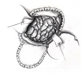 顕微鏡を使わない手術では、全身麻酔後に体位をとり頭部をテープなどで固定しますが、脳血管障害の手術や脳腫瘍摘出術など手術顕微鏡を用いる繊細な手術の場合には、手術中頭部が動かないように金属のピンを用いて専用の固定器に頭をしっかり固定します。皮膚切開は、メスを用いて行い止血のため特殊なクリップ(頭皮クリップ)で皮膚をはさみます(図1)。孤状に切開した皮膚弁をめくり、すぐ下の筋膜や腱膜を剥離すると頭蓋骨が現れます(図2)。頭蓋骨に窓をあけるため、まず専用のドリルで小さな穴をいくつか開けます。これをつなぐ形で電気のこぎりのような器具で頭蓋骨を切ります。骨窓の大きさが予定より小さく、切り取り範囲が不十分な場合には、ヤスリの様なドリルで骨縁を削り取り、窓を大きくします。骨弁を取り外すと、脳を覆う硬膜という丈夫な膜があらわれ、これをハサミで切り開くことにより、クモ膜をかぶった脳の表面が現れます(図3)。このあとは、病変によって異なりますが、一般的に脳をへらで軽く圧排しながら病変にアプローチしたり、脳に小さな切開を入れてその中から脳の中に入って病変を治療します。