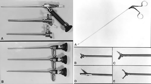 右:硬性鏡に用いられる鉗子類