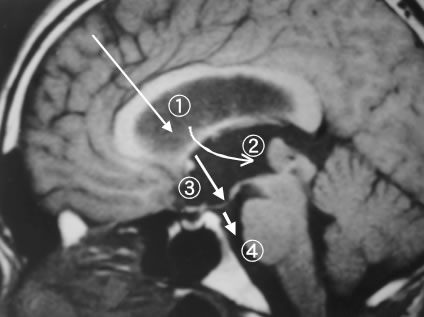 図3 MRI矢状断(右:腹側、左:背側)右前頭部より進入し側脳室に入る(1)。モンロー孔を経由し第三脳室に至り後方を観察(2)腫瘍を確認し灰白隆起(3)を穿孔後、脳底槽を観察し(4)手術を終了する。