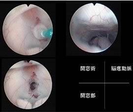 図4:灰白隆起を開窓しバルーンカテーテルにて開窓を広げる(左上)。開窓を終了し(左下)開窓部より脳底槽に内視鏡を進め、脳底動脈を観察する(右上)。