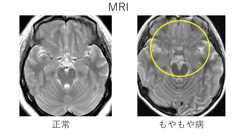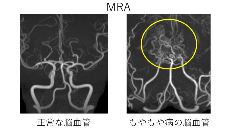 もやもや病の診断に用いられる画像検査はMRI/MRAや脳血管造影で、これを元に確定診断されます(図)。上記のような脱力発作の症状を呈する場合には、不足している血流を補うために頭蓋外内血行再建術(バイパス手術)が勧められます。