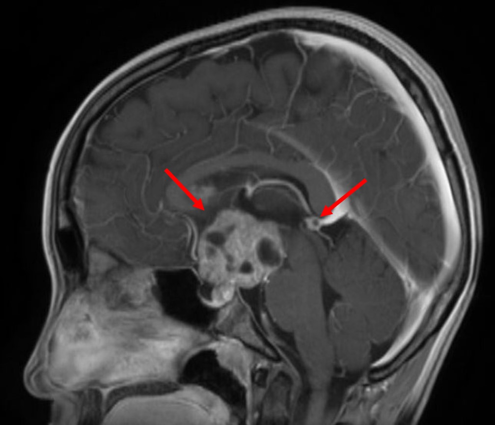 腫瘍が小さいと発生した場所に応じた神経症状がおこります。特に神経下垂体部ではホルモン分泌異常による多尿(尿崩症:1日に5リットル以上の尿がでる)、低身長(成長ホルモンの分泌不全による)、活動性の低下や食欲不振、疲れやすい(副腎皮質ホルモンや甲状腺ホルモンの低下による)、無月経や乳汁分泌、二次性徴の遅れ(性ホルモン分泌異常による)などが代表的な症状です。腫瘍が大きくなると頭蓋内圧亢進症状(頭痛、嘔吐、視覚の症状、意識障害)が起こります。