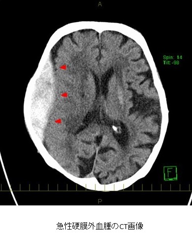 頭部外傷により頭蓋骨と脳を覆う硬膜との間に貯留した血腫を指します。原因としては頭蓋骨線状骨折による中硬膜動脈損傷によるものが多く、その他、静脈洞の損傷が原因となることもあります。若年者に多く、乳児や高齢者では頭蓋骨と硬膜が密着しているため発生頻度は低いとされています。典型的な症状としては、受傷直後は意識レベルが比較的保たれているものの、徐々に血腫増大によって意識障害を始めとする神経症状が進行性に悪化することが特徴的です。脳挫傷などの合併により、はじめから昏睡状態である場合もあります。
