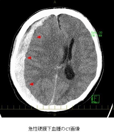 頭部外傷が原因で、脳の表面(くも膜)と硬膜との間に貯留した血腫のことを指します。頭部打撲による脳挫傷や脳表の血管損傷、回転加速度による頭部外傷では架橋静脈の損傷によって生じることがあります。受傷直後から意識障害や運動麻痺を呈している場合もあれば、当初は意識レベルが比較的良くても血腫増大によって神経症状が急速に悪化する場合もあります。特にスポーツに伴う急性硬膜下血腫では脳挫傷を伴わないことが多く、外傷直後に意識障害を認めず、数時間以内に症状が進行することもあり、注意が必要です。衝撃を受けた頭部と反対側に血腫を認めることもあります。診断にはCTによる画像診断が行われ、頭蓋骨と脳の間の三日月状の高吸収域が特徴的です。急性硬膜下血腫は、脳挫傷やびまん性脳損傷などの重篤な脳損傷を合併していることが多いため、著明な脳浮腫が進行し頭蓋内圧亢進(頭蓋内圧の上昇)も認めることがあります。