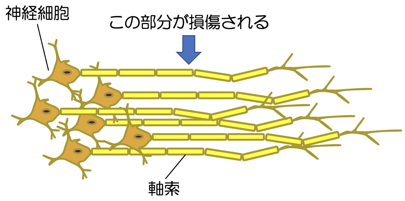 軸索とは、神経細胞の一部が細長く伸びたもので、神経細胞本体からの信号を別の神経細胞に伝える電線のような役割をしているものの一つです。頭部外傷で脳に回転力や揺さぶられるような力が働いた時、白質と呼ばれる脳のなかでも軸索がたくさんある部分が広範に歪み、損傷を受けます。これをびまん性軸索損傷と呼びます。