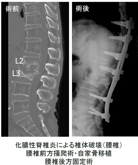 神経症状が悪化する場合、脊柱変形が進行・悪化する場合は、適切な手術を受けることが望まれます。特に、画像診断で膿瘍(細菌感染が膿(うみ)を形成した状態)を認める場合には、早々に手術を考慮しなければなりません。脊椎骨の安定が損なわれた場合、あるいは薬物治療では治癒できない場合なども手術が必要となります。