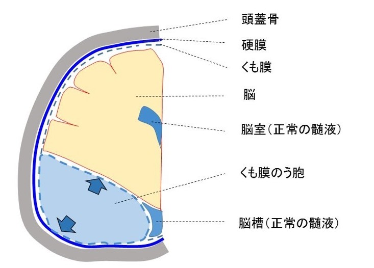脳は、外側から順番に皮膚、頭蓋骨、硬膜、くも膜という構造物で保護されています。くも膜は薄い透明の膜であり、脳との間には髄液という透明の液体が存在します。くも膜のう胞とは、くも膜が袋状になり内部に髄液様の液体が貯留したもので、小さな隙間から髄液が流入し流出が不良なために大きくなると考えられています。