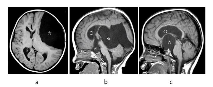 くも膜のう胞のMRI. a; 中頭蓋窩 b; 四丘体部 c; 鞍上部